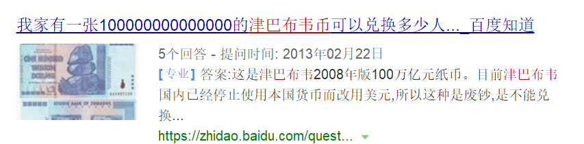 在校园中有一位津巴布韦伴侣曾和我介绍其国内通货膨胀严峻,以致于呈现了一百万亿元的纸币。。。全当今世界只要在津巴布韦能看见如许的钱。