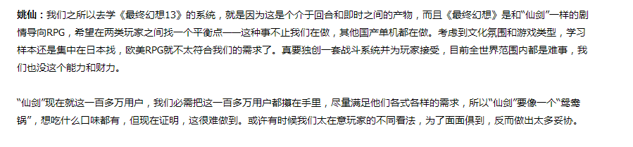 4.最初战斗系统,也很有设法,但是失败的很彻底,以至有人埋怨还不如回合造。那里无论是敖厂长仍是诸位都是喷的很凶猛,我就不多说。姚仙原来目标是循序渐进,然后找了同样剧情向的ff13的战斗系统来借鉴,问题是ff13那个自己就很多人吐槽啊。。。