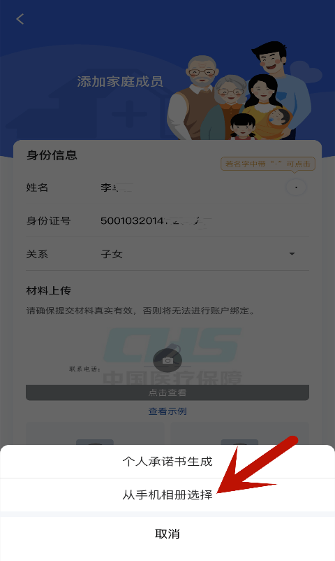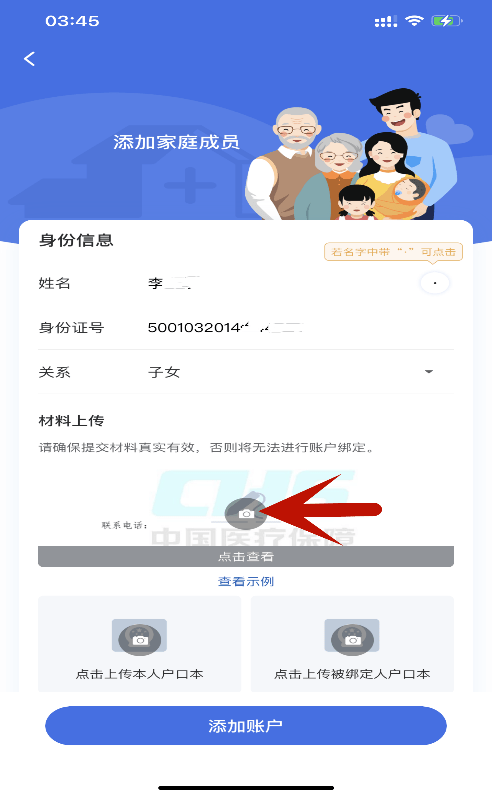 13. 返回“加进配头”介面,点选“点选上载本人户口本”和“点选上载被存取人户口本”。