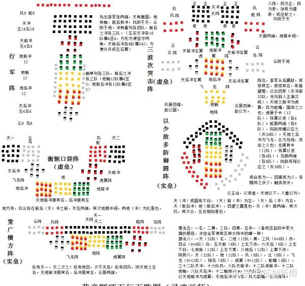 《风后握奇经》记载的是黄帝五行五阵,其阵大致分为摆布两个天冲、风、天前冲、地前冲、地轴、天后冲、地后冲、云那九个部门,九道门各有1队庇护其主将,那也是纯步卒时代所必需的,那9队又办理其下辖的多寡纷歧的108队。到了战车时代,主将乘坐战车后灵活性极大加强,保存才能进步,不太需要庇护队,于是八阵之后又呈现以108队为体例的特征,如《六韬军用篇》及《尹湾西汉简》。而其变阵办法,核心是“天有衡圆,地有轴”。由纵队阵变冲锋阵,其实与纵队阵变革不大,只是主帅所在的地退到最初,轻步卒的风、云担任两翼两波包夹。如许的两翼两波包夹在纯步卒战斗里是很有意义的,对士气的冲击极大,柳成龙《惩烧录》曾提到明代清朝日军的两翼包夹之后的二次包夹很是凶猛,曾国藩《曾文正公奏稿》也曾记录承平军的螃蟹阵操纵其两翼蟹腿的军力停止包夹之后的二次包夹很是凶猛。由纵队阵变圆阵,前面重步卒的天的部门摆布分隔各呈衡条状构成圆圈的前部,后面地的部门缩进构成圆心,轻步卒的风、云则退到后面也呈衡条状构成圆圈的后部。由纵队阵变口袋阵,前面重步卒的天的部门摆布分隔各呈圆团状构成摆布翼,后面地的部门以地为轴心扭转由纵变横构成口袋底。由纵队阵变横阵,前面重步卒的天的部门摆布分隔各呈衡条状构成第一线,后面地的部门以地为轴心扭转由纵变横构成第二线。而纵队阵时,轻步卒的风担任前哨搜刮侦查,轻步卒的云则担任两侧区域的搜刮哨探使命,可以包管行军的全方位平安。有了战车、马队之后,很大一部门侦查使命由战车、马队负责,步卒由轻重步卒的分类变成拿长刀兵防御为主的花阵步卒与以剑盾短刀兵突击为主的纯阵步卒,从而招致九大部门的军种散布与黄帝时代有了极大的差别。