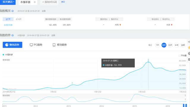 《不朽》手游的收集指数从7月4号就起头上升,因而在上线第二天到达5W4的峰值,可见那款肉搏游戏非常火。