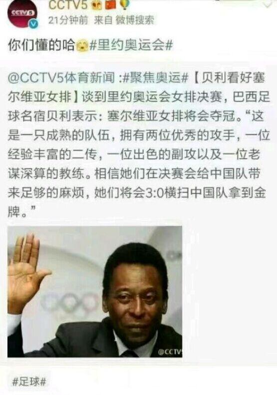 感激中国人民的老伴侣贝利,感激你对巴西女排的爱,感激你的神预测。