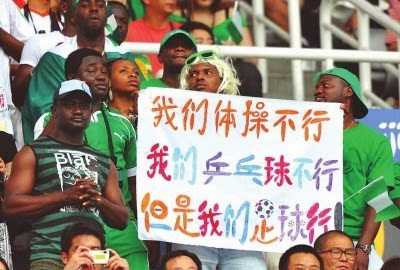 08年奥运会,尼日利亚球迷在尼日利亚对阵比利时的角逐中打出的口号。