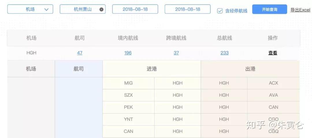 除此之外,Variflight还能帮你查找出一个目标地的所有航班,以至是帮你导出Excel,好比仍是苏州,8月18日此日,苏州萧山机场总共有47个JAA,196条全境航班和37条跨境航班。