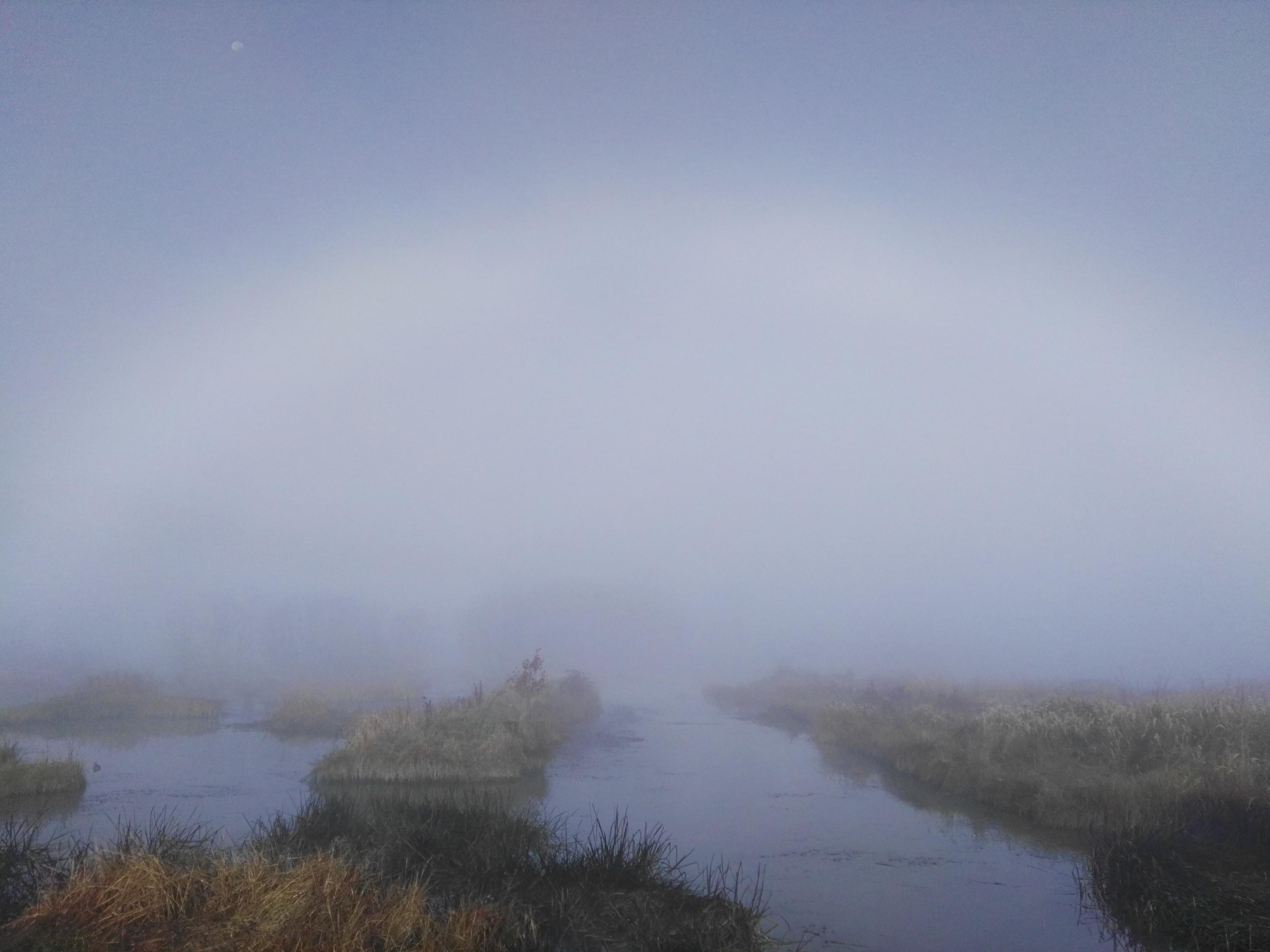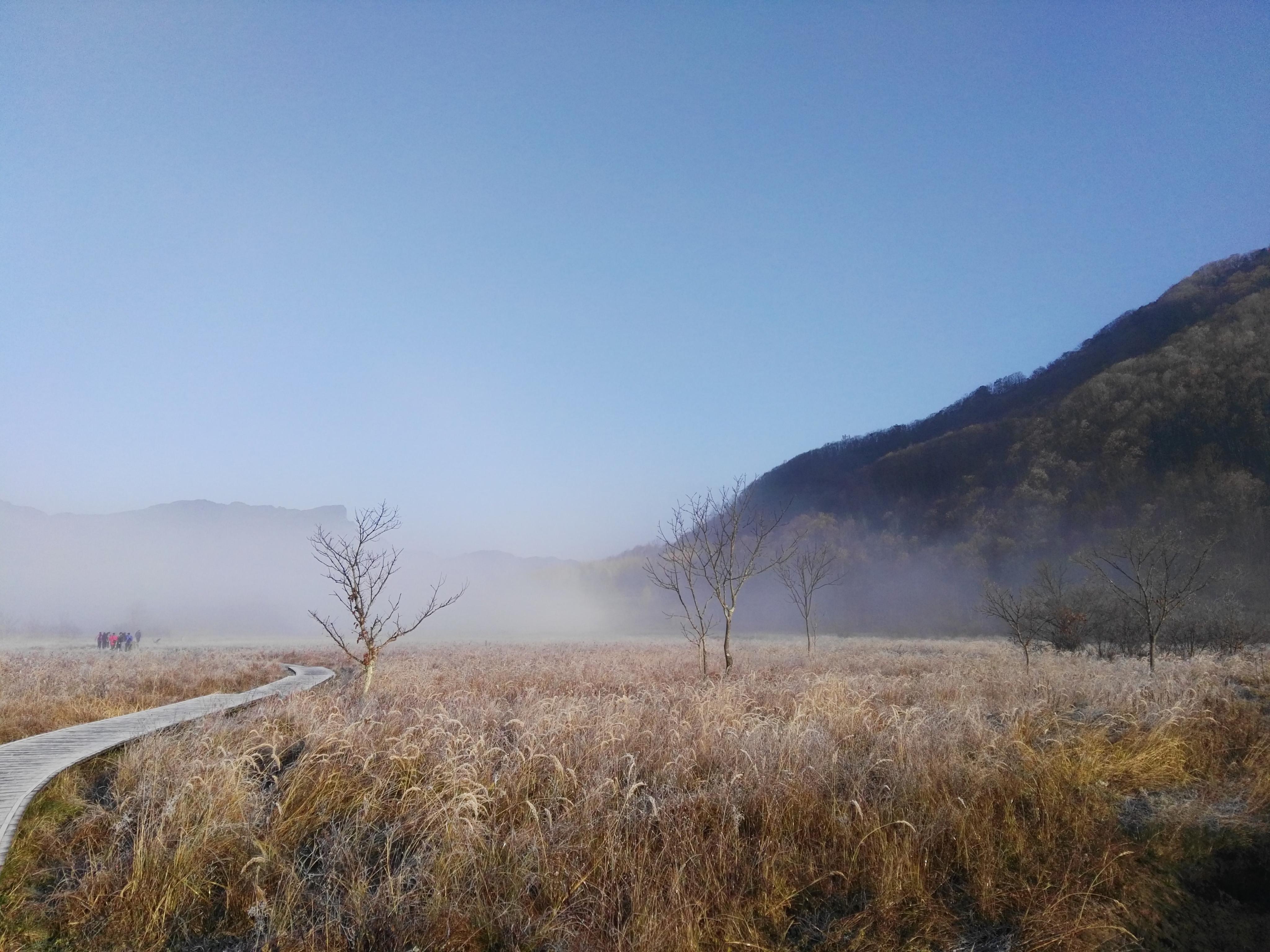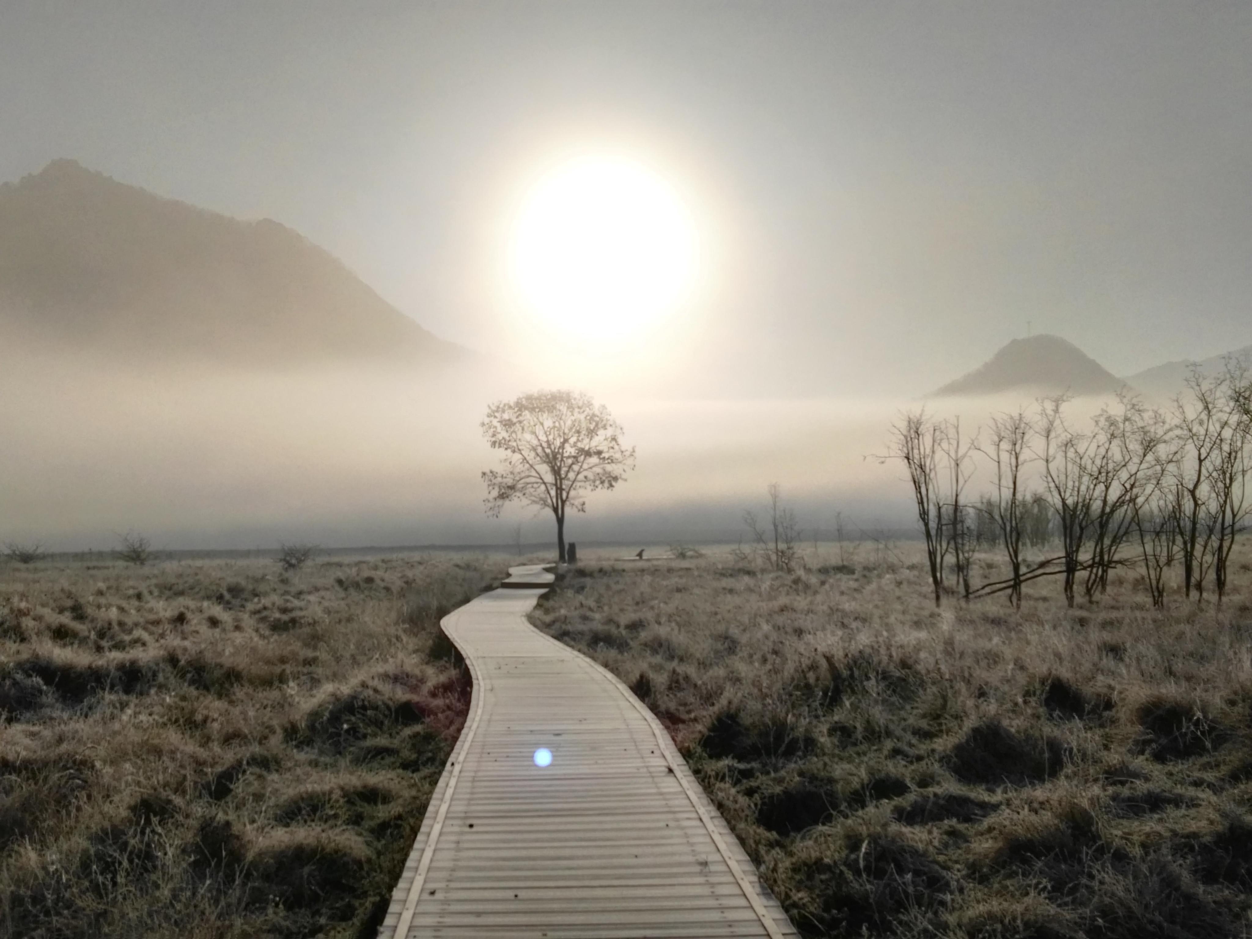 我想我永久也忘不了那天清晨看到的气象。乳白色的雾气在我面前洋溢,厚厚的草苔上结满白霜,我脚下的栈道在草地上不断延伸,没入雾气深处,不知去往何方。似乎世界尽头,又似乎冷酷仙境,我几乎无法用语言描述其时的觉得。此情此景,如梦似幻,以前从未见过,或许以后也不会再有。