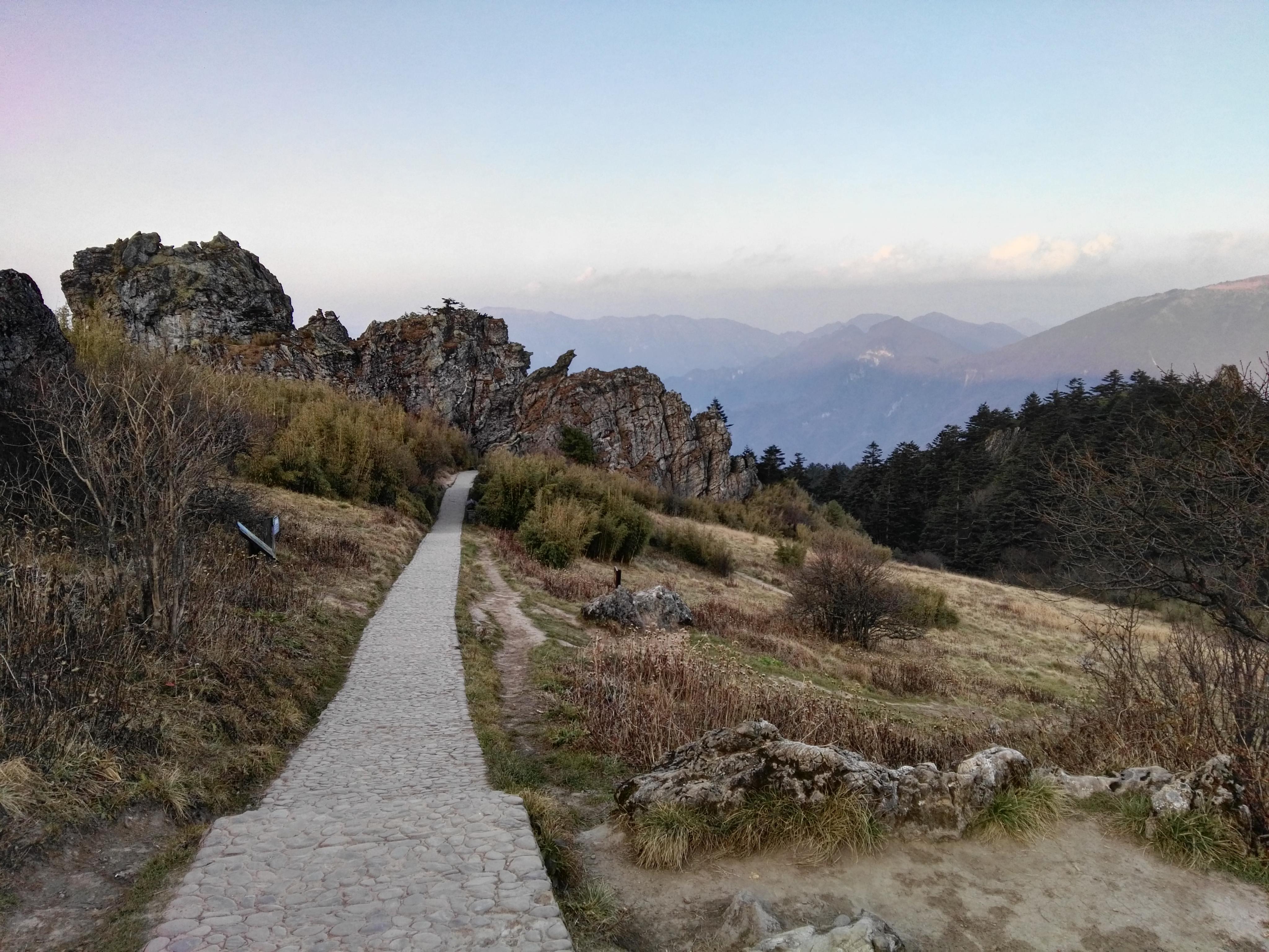 为了看金足草的日出,第五天天不亮他们就起床动身,坐光景区区间车进入金足草,抵达时天刚蒙蒙亮,许多人聚集在那里等着看日出,但其时刚好有一团白色的浓雾遮住了swzs。等雾散的无聊天数,冷得受不了,在四周四处走走,看到旁边有一条栈道,就沿着栈道往前走去。