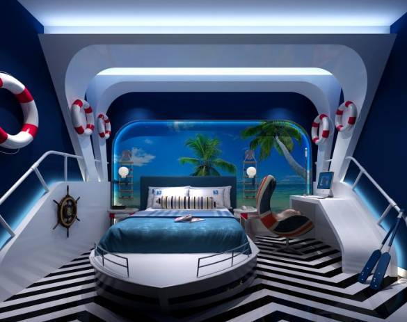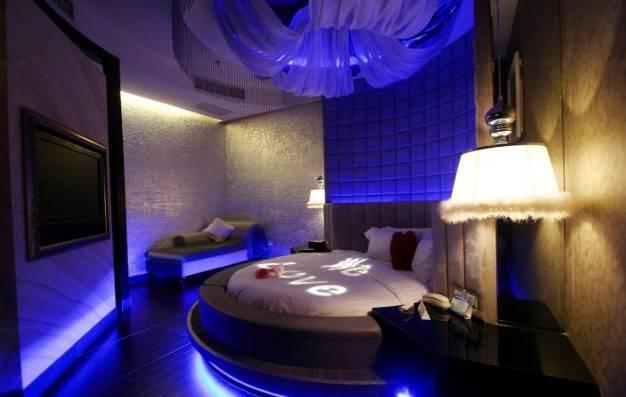 卧室内不单可切换不异的灯光场景,还可自在选择圆床、水床及电动床。