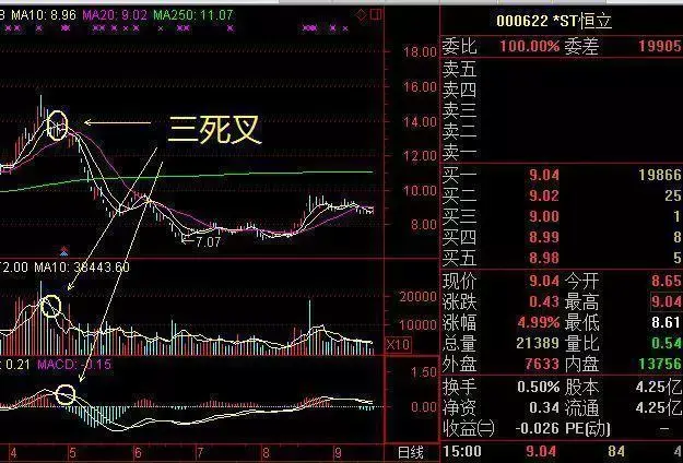 三死叉,也就是说当股价均线、成交量均线、MACD目标都呈现三死叉的时候,此时应该判断卖出。看下图中的st恒立,呈现三死叉后股价一路下滑。