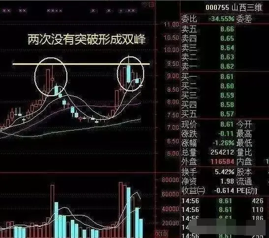 股价持续两次冲击某个价位都呈现了回落,K线组合看起来就是两个高高的双峰。像山西三维就是那个走势,近期两次冲击9.5没有胜利,股价只能顺势回落。