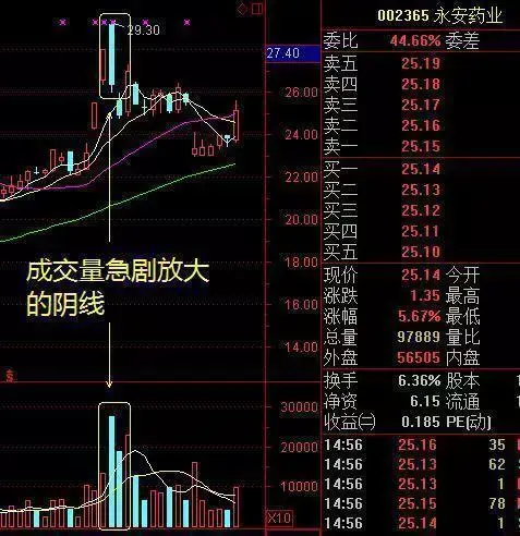 股价在持续上涨后呈现一根大阴线,并且成交量急剧放大,那申明主力在不计成当地出货,此时应该赶紧离场。看下图永安药业